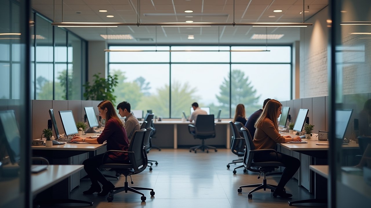 مشهد لمكان عمل حديث مع موظفين من خلفية متنوعة مشتركين في مهامهم