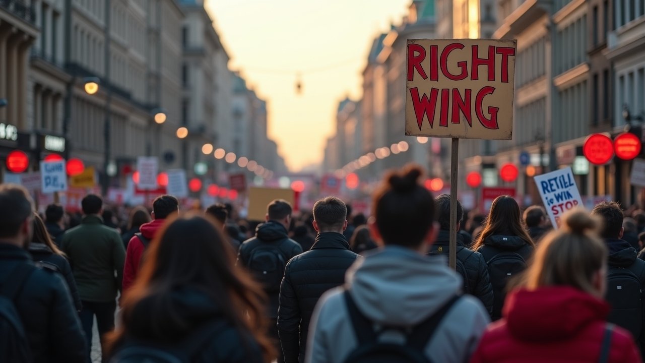صورة واقعية لشارع مزدحم في برلين يظهر علامات على التطرف اليميني