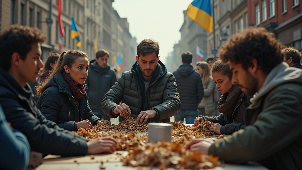 A bustling scene showing Ukrainian refugees in a German city, engaged in various jobs and contributing to the local economy.